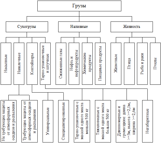 Грузы могут классифицироваться по различным признакам в зависимости от поставленных целей. Основная транспортная классификация грузов строится в зависимости от вида и состояния груза, предъявленного к перевозке. По этому признаку все грузы можно объединить в три большие группы: