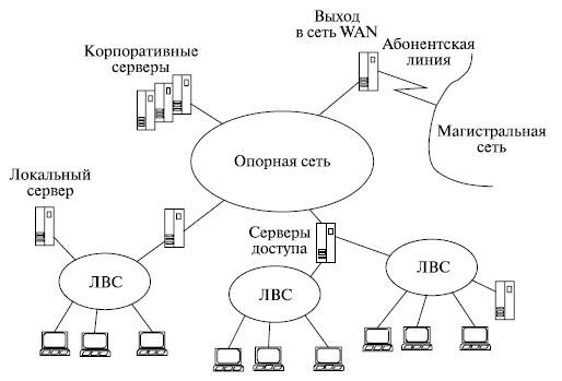 Обычно создание выделенной магистральной сети, т. е. сети, обслуживающей единственную организацию, обходится для этой организации слишком дорого. Поэтому чаще прибегают к услугам провайдера, т. е. фирмы, предоставляющей телекоммуникационные услуги многим пользователям. В этом случае внутри корпоративной сети связь на значительных расстояниях осуществляется через магистральную сеть общего пользования. В качестве такой сети можно использовать, например, городскую или междугородную телефонную сеть или территориальные сети передачи данных. Наиболее распространенной формой доступа к этим сетям в настоящее время является обращение к глобальной вычислительной сети Internet.