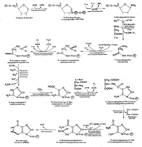 ФРПФ взаимодействует с глутамином, являющимся донором NH2-группы, в результате чего образуется b-5-фосфорибозил-амин. На следующей стадии присоединяется вся молекула глицина к свободной NH2-группе b-5-фосфорибозил-амина с образованием глицинамидрибонуклеотида. Затем цепь удлиняется за счет присоединения формильной группы из N5, N10-метил-ТГФК (ТГФК – тетрагидрофолиевая кислота) с образованием формилглицинамидрибонуклеотида. На формильную группу формилглицинамидрибонуклеотида переносится далее амидная группа глутамина и синтезируется формилглицинамидинрибонуклеотид. На следующей стадии замыкается пятичленное имидазольное кольцо и образуется 5-аминоимидазолрибонуклеотид, который способен акцептировать СО2 с образованием рибонуклеотида 5-аминоимидазол-4-карбоновой кислоты. В последующем двухступенчатом процессе, в котором участвуют аспарагиновая кислота и АТФ, образуется 5-аминоимидазол-4 карбоксамидрибонуклеотид и освобождается фумаровая кислота. В этих реакциях азот аспарагиновой кислоты включается в 1-е положение будущего пуринового ядра. Последний углеродный атом пиримидинового остатка кольца пурина вводится в виде формильного остатка (источник N10-метил-ТГФК), который присоединяется к 5-NH2-группе. После этого отщепляется молекула воды и второе кольцо замыкается. В результате образуется первый пуриновый нуклеотид – ИМФ. АМФ и ГМФ образуются из ИМФ.