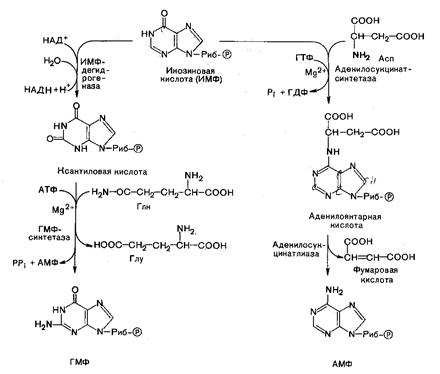 В синтезе АМФ из ИМФ специфическое участие принимают аспарагиновая кислота, являющаяся донором NH2-группы, и ГТФ в качестве источника энергии; промежуточным продуктом реакции является аденилоянтарная кислота. Биосинтез ГМФ, напротив, начинается с дегидрогеназной реакции ИМФ с образованием ксантозиловой кислоты.