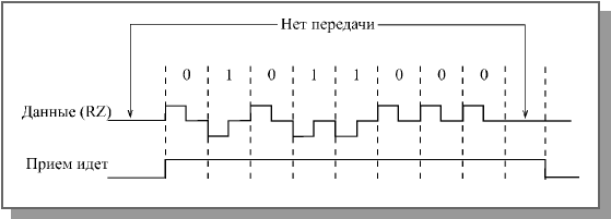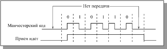 Как и при коде RZ, в данном случае приемник легко может определить не только начало передаваемой последовательности бит, но и ее конец. Если в течение битового интервала нет перехода сигнала, то прием заканчивается. В манчестерском коде можно передавать последовательности бит переменной длины (рис. 6). Процесс определения времени передачи называют еще контролем несущей, хотя в явном виде несущей частоты в данном случае не присутствует.
