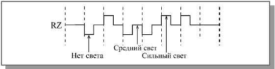 Код RZ применяется не только в сетях на основе электрического кабеля, но и в оптоволоконных сетях. Правда, в них не существует положительных и отрицательных уровней сигнала, поэтому используется три следующие уровня: отсутствие света, "средний" свет, "сильный" свет. Это очень удобно: даже когда нет передачи информации, свет все равно присутствует, что позволяет легко определить целостность оптоволоконной линии связи без дополнительных мер (рис. 4).