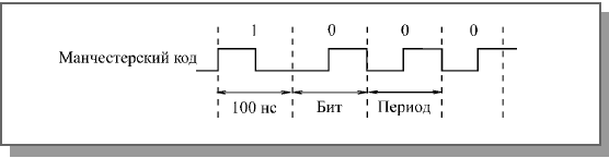 Манчестерский код (или код Манчестер-II) получил наибольшее распространение в локальных сетях. Он также относится к самосинхронизирующимся кодам, но в отличие от RZ имеет не три, а всего два уровня, что способствует его лучшей помехозащищенности и упрощению приемных и передающих узлов. Логическому нулю соответствует положительный переход в центре битового интервала (то есть первая половина битового интервала – низкий уровень, вторая половина – высокий), а логической единице соответствует отрицательный переход в центре битового интервала (или наоборот).