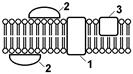 | Рис. 409111002. Белки биомембраны: 1 – интегральный, 2 – периферические, 3 – полуинтегральный. |