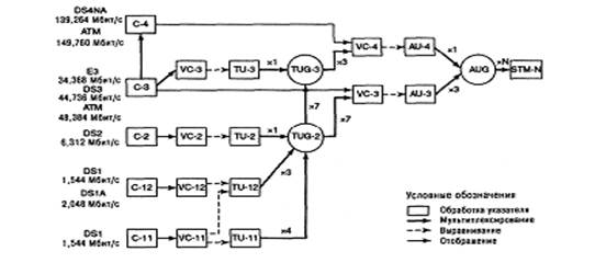 Основным строительным блоком SDH является синхронный транспортный модуль уровня 1 (STM-1), имеющий скорость 155,52 Мбит/с. Полезная нагрузка с меньшей скоростью отображается на поле полезной нагрузки STM-1, а сигналы более высоких скоростей генерируются путем синхронного мультиплексирования N сигналов STM-1, для формирования сигналов STM-N. Транспортный заголовок сигнала STM-N в N раз больше транспортного заголовка STM-1, а скорость передачи составляет N∗155,52 Мбит/с. В настоящее время только STM-1, STM-4, STM-16 и STM-64 определены в стандартах ITU-T (STM-256 находится в стадии стандартизации).