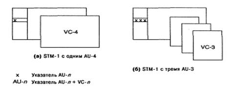 Блок AU-4 может быть использован для передачи, с помощью VC-4, ряда блоков TU-n (n = 1,2,3), формирующих два каскада мультиплексирования. Пример этого приведен на рисунках 6(а) и 7(а).