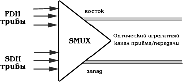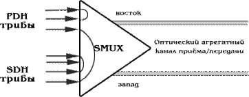 Мультиплексор ввода/вывода ADM может иметь на входе тот же набор трибов, что и терминальный мультиплексор (рис.1). Он позволяет вводить/выводить соответствующие им каналы. Дополнительно к возможностям коммутации, обеспечиваемым ТМ, ADM позволяет осуществлять сквозную коммутацию выходных потоков в обоих направлениях, а также осуществлять замыкание канала приёма на канал передачи на обеих сторонах ( "восточный" и "западный") в случае выхода из строя одного из направлений. Наконец, он позволяет (в случае аварийного выхода из строя мультиплексора) пропускать основной оптический поток мимо него в обходном режиме. Всё это даёт возможность использовать ADM в топологиях типа кольца.