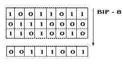 В системе SDH используется метод контроля параметров ошибки без отключения канала, который получил название метода контроля четности (Bit Interleaved Parity - ВIР). Этот метод, также как и CRC, является оценочным, но он дает хорошие результаты при анализе систем передачи SDH. Алгоритм контроля четности достаточно прост (рис.19). Контроль четности выполняется для конкретного блока данных цикла в пределах групп данных по 2, 8 и 24 бита (BIP-2, BIP-8 и В1Р-24 соответственно). Эти группы данных организуются в столбцы, затем для каждого столбца рассчитывается его четность, т.е. четное или нечетное количество единиц в столбце. Результат подсчета передается в виде кодового слова на приемную сторону. На приемной стороне делается аналогичный расчет, сравнивается с результатом и делается вывод о количестве ошибок четности. Результат сравнения передается в направлении, обратном передаче потока.