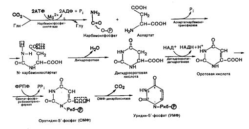 На второй стадии карбомоилфосфат реагирует с аспартатом, в результате чего образуется N-карбомоиласпарагиновая кислота. Последняя подвергается циклизации (под действием дигидрооротазы) с отщеплением молекулы воды, при этом образуется дигидрооротовая кислота, которая, подвергаясь дегидрированию, превращается в оротовую кислоту. В этой реакции участвует специфический НАД-содержащий фермент дигидрооротатдегидрогеназа. Оротовая кислота обратимо реагирует с ФРПФ, являющимся донатором рибозо-фосфата, с образованием оротидин-5/-фосфата (ОМФ). Дегидрокарбоксирилирование последнего приводит к образованию первого нуклеотида – уридин-5-фосфата (УМФ).