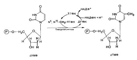При синтезе тимидинмонофосфата (ТМФ) требуется участие донора метильной группы, которым является N5, N10-метилен-ТГФК. В клетках имеется особый фермент тимидилатсинтаза, катализирующая метилирование не свободного урацила, а dУМФ.