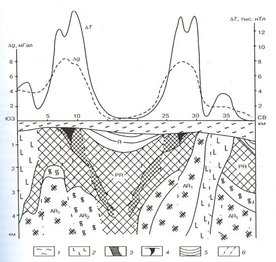 1 – платформенный чехол, χ = 45*10-5СИ, σ = 3,3 г/см3; 2 – габброиды, χ = 1500*10-5СИ, σ = 2,9 г/см3; 3 железистые кварциты, χ = 2,0 СИ, σ = 3,3 г/см3; 4 окисленные руды, , χ = 10-2 СИ, σ = 3,4 г/см3; 5 песчаники и аргиллиты, χ = 10-2 СИ, σ = 2,69 г/см3; 6 – тектонические нарушения (В.В. Бродовой, А.А. Иванов, 2004)