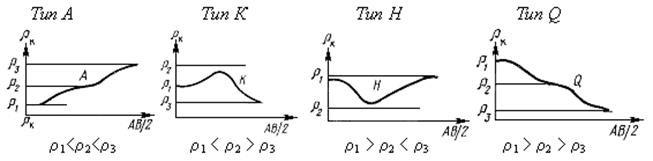 Первоначально по результатам полевых измерений строятся в билогарифмическом масштабе (по осям абцисс и ординат логарифмический масштаб с заданным модулем) кривые ЭЗ с последующей качественной и количественной интерпретацией. Последняя представляет собой достаточно сложный процесс. Основной рабочей моделью служит трехслойный геоэлектрический разрез, согласно которому все кривые зондирования разделяются на четыре типа: