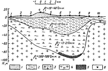 3 - глинистый конгломерат, 4 - гранит, 5 - бокситы, 6 - точки ВЭЗ