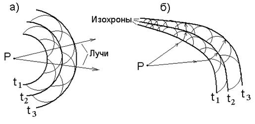 Согласно принципу Гюйгенса-Френеля каждая точка среды самостоятельный источник волн. Форма этих волн - вид затухающих синусоид. Вся волновая поверхность является огибающей семейства элементарных волн (сфер малых радиусов), при том, что их интерференция обусловливает за пределами волнового фронта степень интенсивности (амплитуду) суммарной упругой волны. В однородной изотропной среде все лучи распространения волн прямолинейны (рис. 2.36-а), а в неоднородно-слоистой, в силу преломления, эти лучи криволинейны (рис. 2.36-б).
