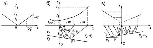 Рис. 2.43. Годограф прямой (а), отраженной (б) и преломленной (в) волн