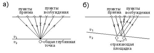 Для эффективного использования МОВ подбирают мощность источника таким образом, чтобы упругие колебания, то есть сейсмические волны в результате отражения имели достаточную амплитуду для преимущественного выделения однократных волн на фоне многократно отраженных. В практике полевых работ применяются схемы с отнесением точки записи к пункту возбуждения (ПВ) или приема (ПП). При этом, распространенным является способ, получивший название ОГТ - общей глубинной точки (центру между ПВ и ПП). При таких схемах размещения ПВ и ПП имеется возможность «привязывать» наблюдения на отражающей горизонтальной границе к каждой конкретной ее точке (рис. 2.44-а) или к площадке, образуемой вместо точки по восстанию отражающей наклонной границы (рис. 2.44-б).