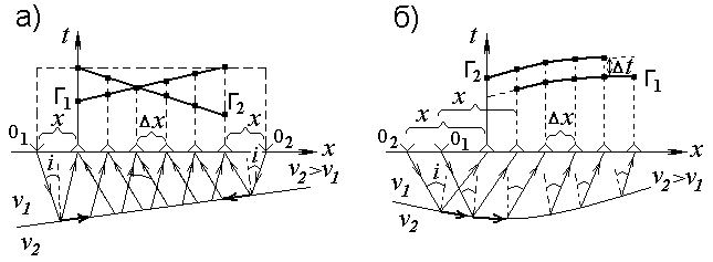 При работах МПВ различают расстановку сейсмоприемников с расположением пунктов возбуждения на двух или одном флангах. По результатам наблюдений в первом случае строятся встречные, а во втором нагоняющие годографы. Система встречных годографов за счет их увязки во взаимных точках, соответствующих пунктам возбуждения О1 и О2, позволяет уверенно распознавать волны от преломляющих границ и их прослеживание по площади (рис. 2.46-а). Система нагоняющих годографов, построенных по данным возбуждений в двух односторонних пунктах, дает возможность проследить непрерывность преломляющей границы по признаку параллельного смещения годографов на величину ∆t рис. 2.46-б).