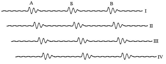 I – IV – сейсмотрассы, А,Б,В – пакеты однократных волн маркирующих горизонтов