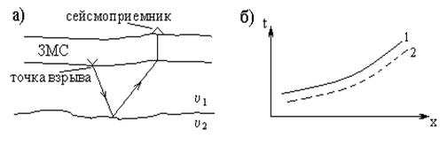 Рис. 2.51. Влияние ЗМС на кинематику отраженных волн (а) и пример приведения годографа, построенного по экспериментальным данным, к исправленным значениям (б)