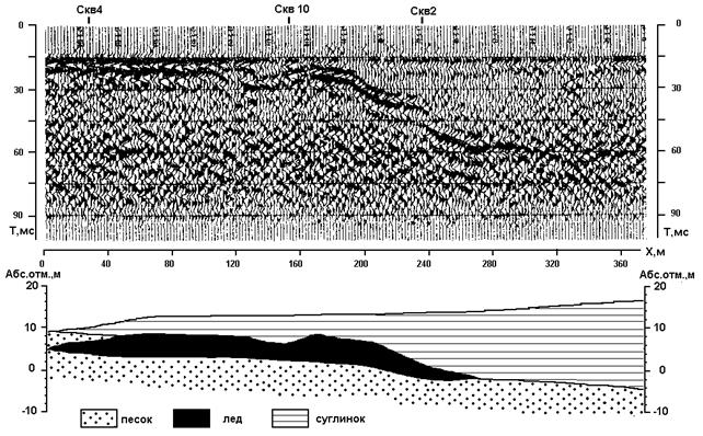 Рис. 2.52. Временной сейсмический разрез на участке распространения пластовых льдов (Ямал, Бованенковское газоконденсатное месторождение)