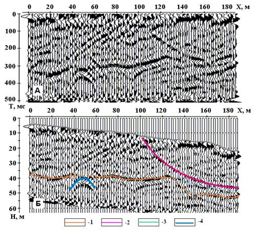 Рис.2.53. Временной (А) и глубинный (Б) разрезы ОГТ на оползневом участке