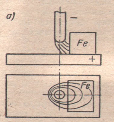 Наличие вблизи сварочной дуги значительных ферромагнитных масс также нарушает симметричность магнитного поля дуги и вызывает отклонение дуги в сторону этих масс. Рис. 5.