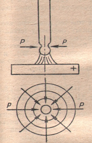 Под действием сжимающих электромагнитных сил и высокой температуры на конце электрода происходит плавление металла, образование и отрыв капли металла, которая переносится на изделие. Рис. 7.