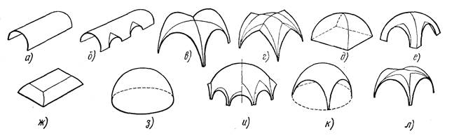 а — цилиндрический свод; 0 — то же, с распалубками; в — крестовый свод; г — то же, вспарушенный со стрельчатым очертанием арок (готический свод); д — сомкнутый свод; е — то же, с распалуСкаын; ж — зеркальный свод; з — сферический купол; и — то же, с распалубками разных видов; к—парусный свод; л — то же, с распалубками