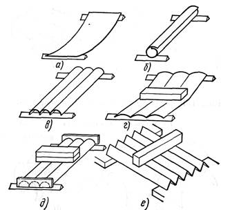 Складчатые конструкции, как и цилиндрические оболочки, можно проиллюстрировать на бумажной модели (рис. 6, а). Лист бумаги, согнутый в виде «гармошки», не только несет сам себя, но и выдерживает определенную нагрузку, а укрепленный по торцам диафрагмами жесткости, значительно повышает свою несущую способность. Типы складок показаны на рис. 12.