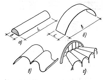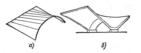 Конусные оболочки (рис. 7,г) также являются разновидностью цилиндрической оболочки. Их используют в различных зданиях (рынки, выставочные залы, гаражи), имеющих в плане круглое или веерообразное очертание.