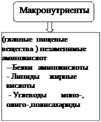 В группу главных пищевых веществ (по международной классификации) входят макронутриенты (белки, жиры, углеводы, витамины и вода), макроэлементы и микроэлементы.