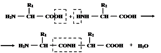 По теории Э. Фишера аминокислоты присоединены друг к другу ковалентной амидной связью, которая возникает при взаимодействии α-карбоксильной группы одной аминокислоты с α-аминогруппой другой амино