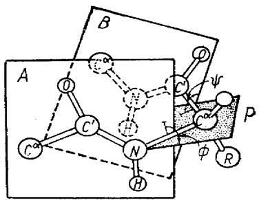 А и В - плоскости двух связанных пептидных единиц; Р - плоскость, содержащая связи С
