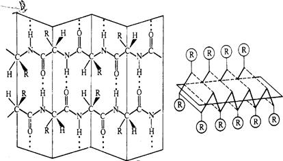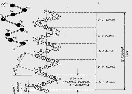 Отдельные витки спирали удерживаются многочисленными водородными связями с участием водорода аминогруппы и атома кислорода группы СО. При образовании спиралей радикалы, карбоксильные группы и аминогруппы остаются снаружи, что обуславливает возможность образования третичной структуры белка.