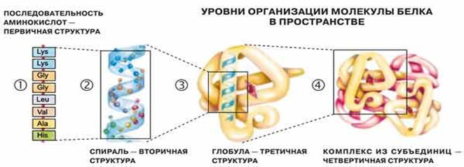 Структурная организация белковой молекулы имеет определенную иерархию структурных уровней, берущую начало от первичной структуры и заканчивающуюся четвертичной.