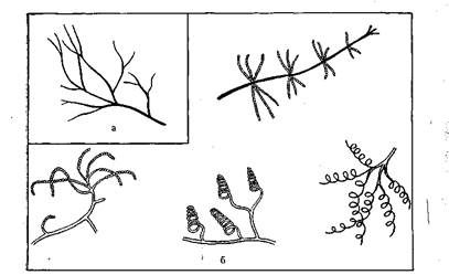 Рис. 2. Актиномицеты: а — мицелий; б — спороносцы