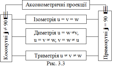 Залежно від напрямку проекціювання аксонометричні проекції розділяють на косокутні (кут φ між напрямком проектування S і площиною проекцій П' не дорівнює 90°) і прямокутні (напрямок проектування є перпендикулярний до площини П'). В залежності від величини коефіцієнтів спотворення розрізняють три види аксонометричних проекцій: ізометрію, диметрію й триметрію (рис. 3.3).