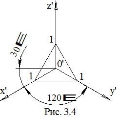 Аксонометричні осі в прямокутній аксонометрії розташовуються під кутом 120° одна до одної, при вертикальному розташуванні осі z' (рис. 3.4). Там же показаний напрямок штрихування в координатних площинах (на всіх осях відкладають рівні відрізки).