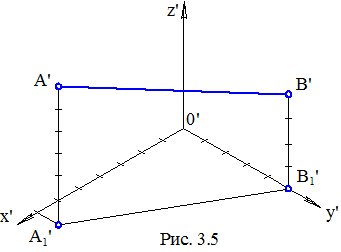 Побудову відрізка АВ (рис. 3.5) і піраміди (рис. 3.6) у прямокутній диметрії проводять аналогічно, але уздовж осі y' відкладають відрізки, рівні половині їхньої дійсної величини. Читачеві ці побудови рекомендуємо виконати самостійно.