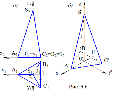 Наприклад, побудуємо аксонометричне зображення правильної трикутної піраміди (рис. 3.6). Геометричне тіло віднесемо до системи трьох взаємно перпендикулярних осей xyzО (рис. 3.6, а). Точки А і S розташовуються на осях x і z, їхні аксонометричні проекції також будуть лежати, відповідно, на осях x' й z'. При побудові вершин В і С використаємо паралельність ребра ВС осі y. На продовженні осі x' відзначимо точку 1', що належить ребру ВС, і через неї проведемо лінію паралельну осі y'. Від точки 1', в обидві сторони по цій лінії, відкладемо рівні відрізки, узяті на горизонтальній проекції ортогонального креслення від точки 11 до В1 або С1. Отримані вершини з'єднаємо лініями з урахуванням їх видимості.