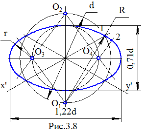 Короткий опис побудови овалу (рис. 3.8). У точці перетину аксонометричних осей x' і y' проводять вертикальну й горизонтальну осі овалу. З цієї ж точки проводять допоміжне коло діаметром d, рівним дійсній величині діаметра зображуваного кола, і відзначають точки перетину цього окружності з аксонометричними осями (відзначена одна точка – 1). Із точок О1 і О2, як із центрів радіусом R = О11, проводять дві дуги, приналежні овалу.