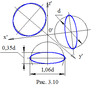 У прямокутної диметрії рівні кола діаметра d, що лежать у координатних площинах x'O'y' і y'O'z', проекціюються в рівні еліпси, велика вісь яких дорівнює 1,06d, а мала – 0,35d, якщо використовуються наведені коефіцієнти спотворення. Коло, розташоване в площині x'O'z', проекціюється в еліпс з осями: велика вісь – 1,06d, мала вісь – 0,95d. Розташування еліпсів у координатних площинах показане на рис. 3.10.