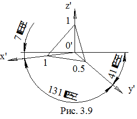 Для стандартної прямокутної диметрії, у якої v = 0,5u, із співвідношення u2 + v2 + w2 = 2 маємо: u2 = 8/9; u = w = 0,94; v = 0,47. Практичні побудови в диметрії виконують, користуючись наведеними коефіцієнтами спотворення U = W = 1 і V = 0,5. Побудоване в такий спосіб зображення буде більше самого предмета в 1,06 раза. Розташування осей в диметрії показане на рис. 3.9. Напрямок штрихування в координатних площинах одержують, відклавши рівні одиниці відрізки на осях x' і z', а по осі v' – 0,5.