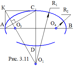 З точок А і С проводять лінії паралельні осям, і на перетині відзначають точку К. Із цієї точки проводять пряму перпендикулярну відрізку АС, і у точках перетину з великою віссю і з продовженням лінії, на якій розташована мала вісь, відзначають центри радіусів R1 і R2. Величина радіусів визначається відрізками R1 = O1C, R2 = O3A. З чотирьох центрів (один центр – О2 на рисунку не показаний) проводять дуги кіл, а проміжки між ними з'єднують потім плавними кривими лініями за допомогою лекал.
