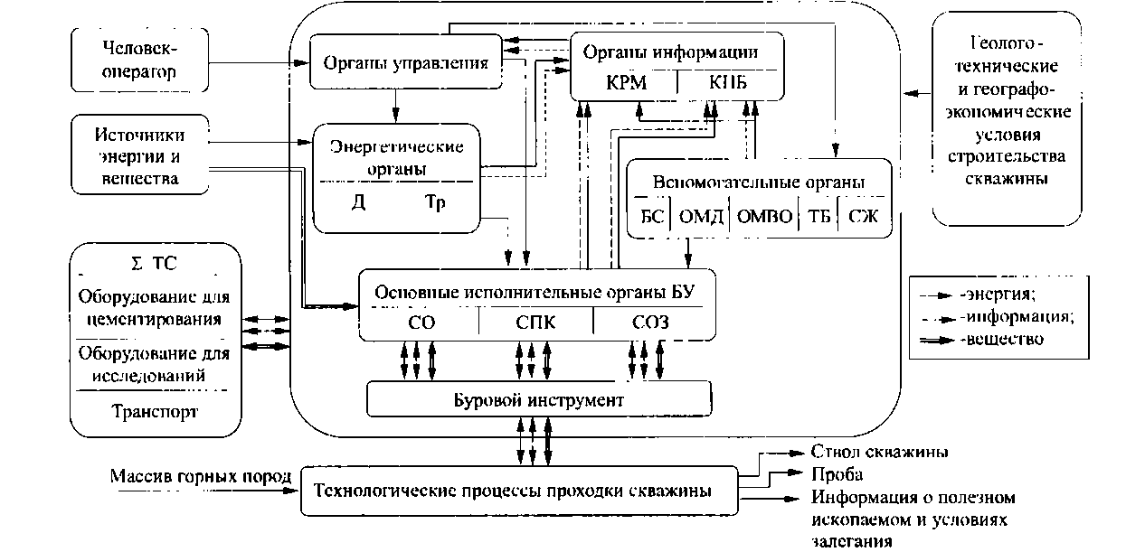 СО - силовые органы; СПК - спуско-подъемный комплекс; СОЗ - система очистки забоя; БС - буровые сооружения; ОМД - органы монтажа и демонтажа; ОМВО - органы для механизации вспомогательных операций; ТБ - транспортная база; СЖ - система жизнеобеспечения; Д - двигатель; Тр - трансмиссия; КРМ - контроль работы механизмов; КПБ - контроль процесса бурения