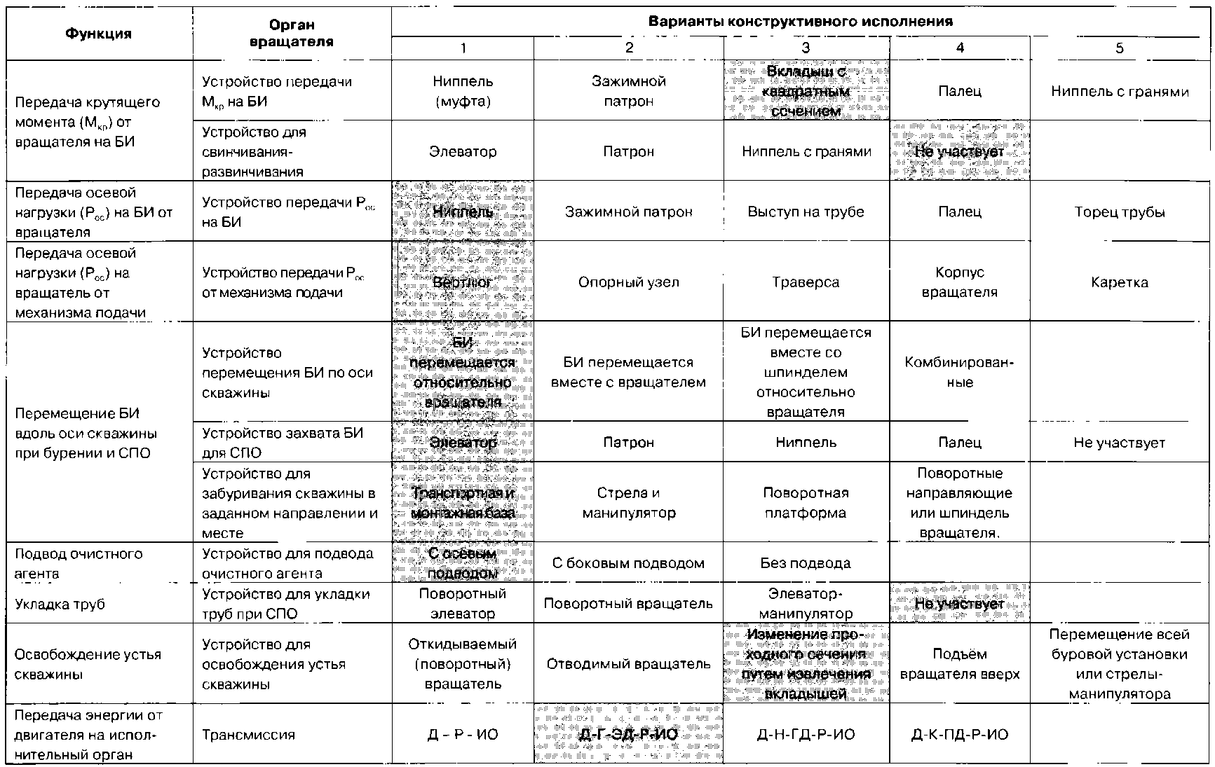 Таблица 3.1.2 – Варианты конструктивного исполнения органов (узлов) вращателей