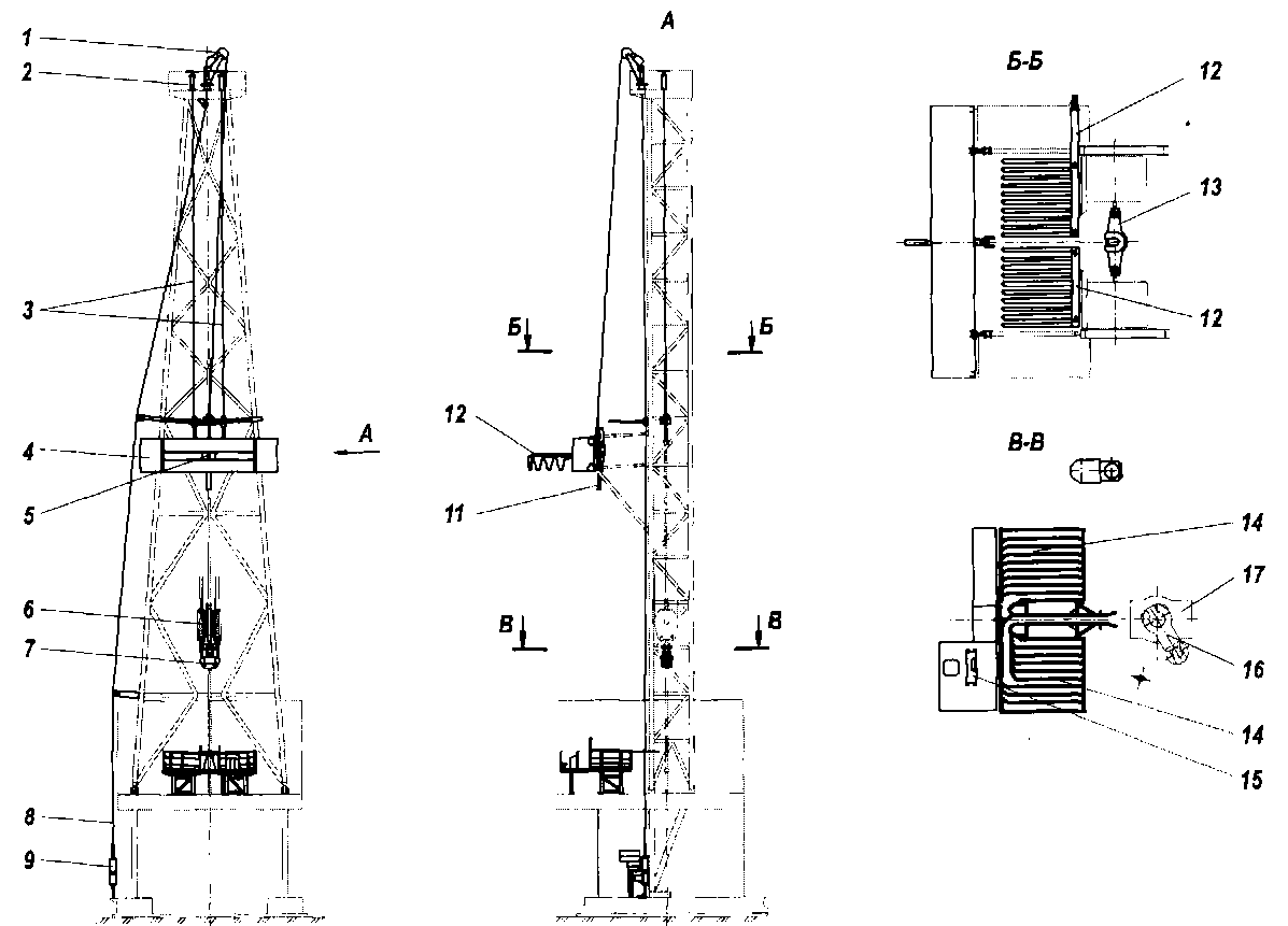 1 - рама кронблока; 2 - стойки крепления козел; 3 - секция шкивов;