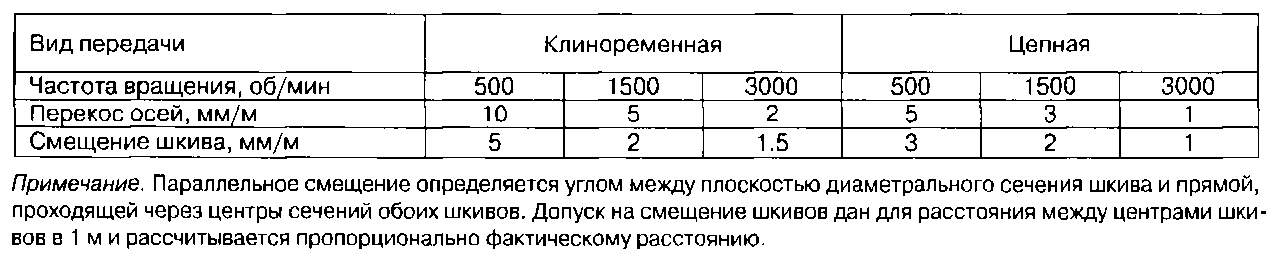 Допускаемые перекосы осей и параллельность смещения шкивов клиноремен-ных и звездочных цепных передач даны в табл. 14.2, а в табл. 14.3 приведены данные для соединительных муфт.