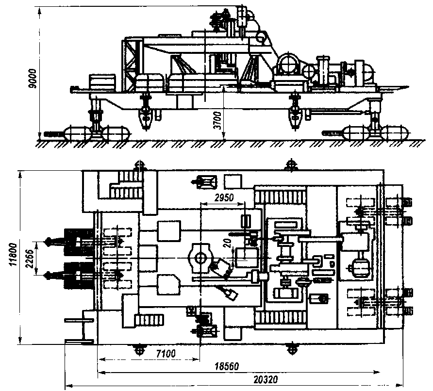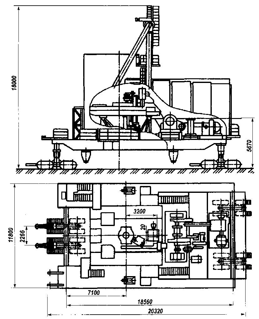 Буровая установка при крупноблочном способе транспортируется следующими крупными блоками: вышечно-лебедочный (без вышки), насосный; вышка; остальные части - мелкими блоками, а приемный мост и коммуникации - универсальным транспортом. Для транспортирования вышечно-лебедочного блока необходимо не менее четырех тяжеловозов ТГ-60 или Т-60. Тяжеловозы ТГ-60 на гусеничном ходу применяются на грунтовых трассах, а Т-60 - на трассах с бетонным покрытием. Когда используются два тяжеловоза под передний кронштейн устанавливают балансир (тяжеловозы спаривают с помощью специальной тяги). Задние тяжеловозы могут быть установлены для транспортирования с колеёй по осям тяжеловозов, равной 4000 или 6000 мм. При этом (в зависимости от условий рельефа местности и состояния трассы) рекомендуется два варианта транспортирования. Первый вариант - вышечно-лебедочный блок транспортируется (рис. 7.14) в собранном виде вместе с устройством для подъема вышки и укрытием. При этом транспортируемая масса блока 208 т, допустимый продольный уклон при спуске 25°, при подъеме 5°, а поперечный крен 2°. При втором варианте— вышечно-лебедочный блок транспортируется с демонтированным устройством для подъема вышки и укрытием (рис. 7.15). При этом транспортируемая масса 190 т, допустимый уклон продольный при спуске 20°, при подъеме 20°, а поперечный крен 6°.