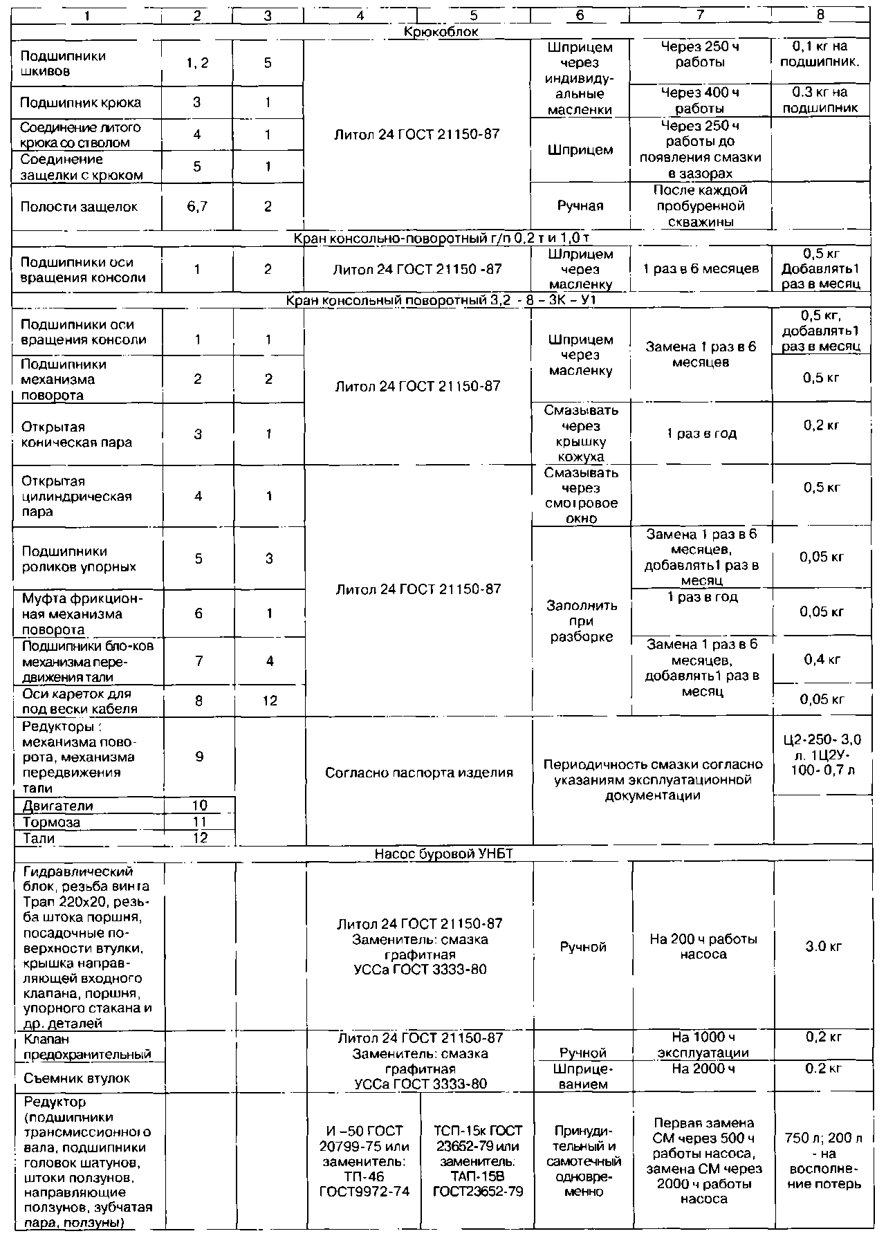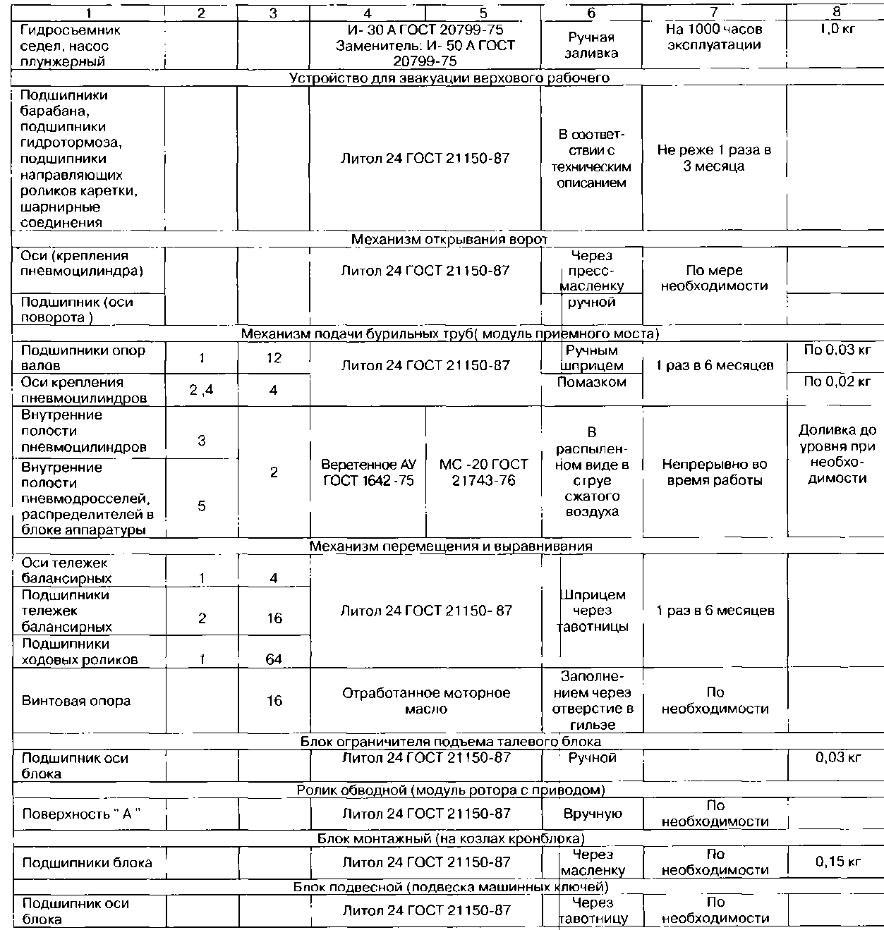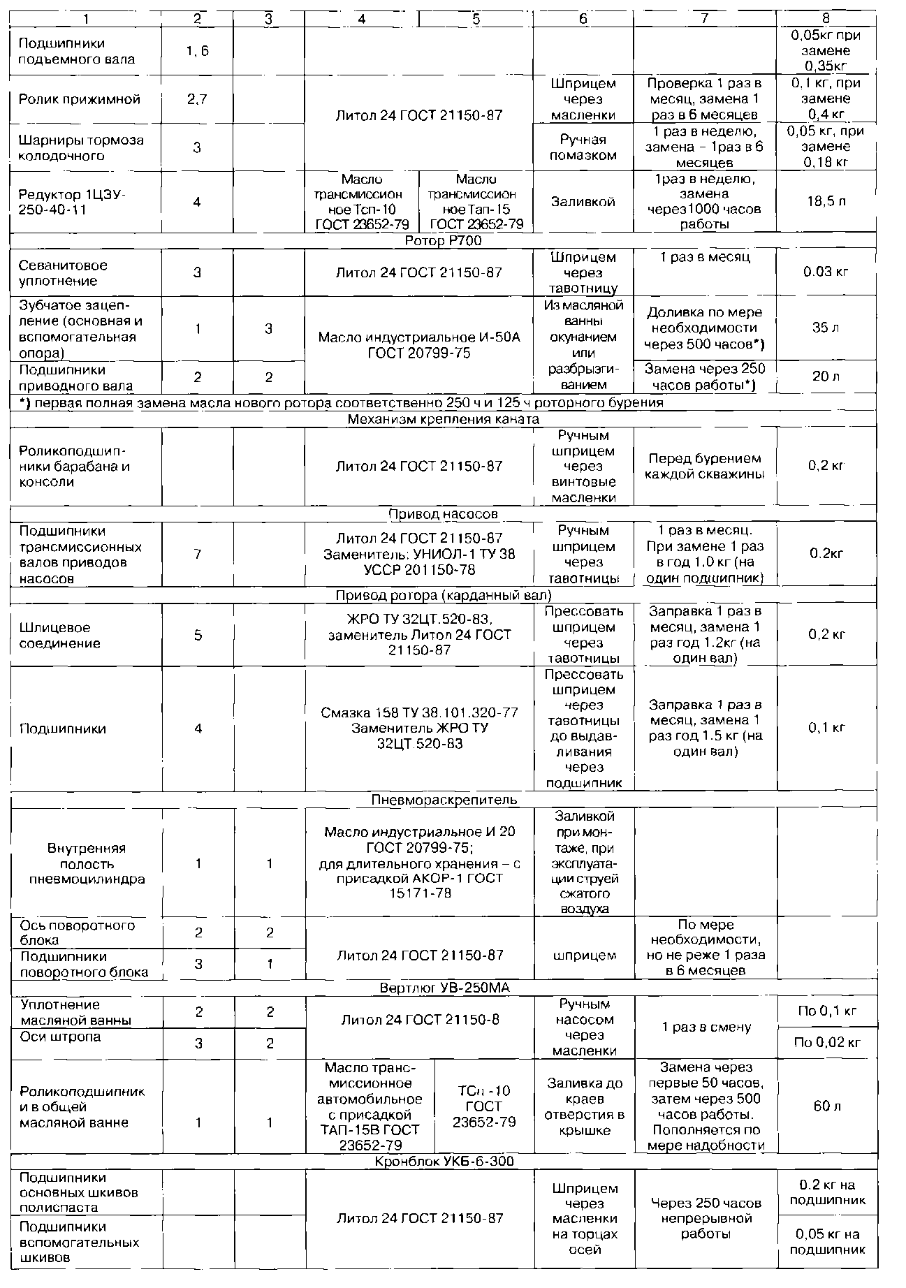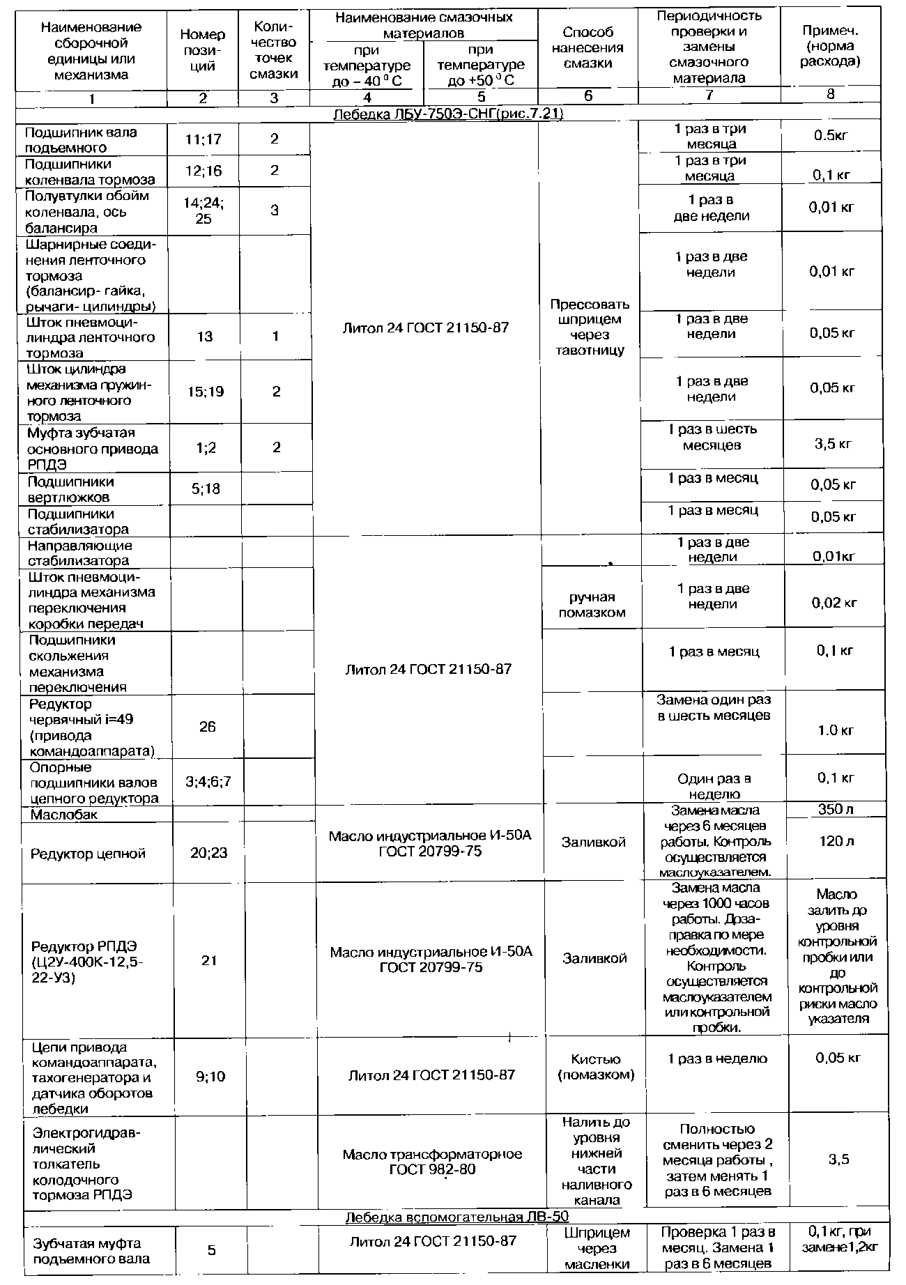 Остальные узлы и механизмы, в том числе покупные изделия, не перечисленные в таблице, подвергаются смазке согласно технической документации завода - изготовителя покупного изделия.